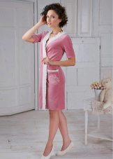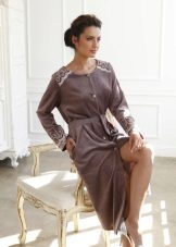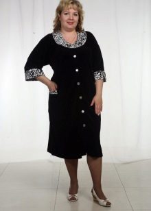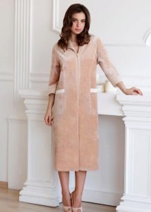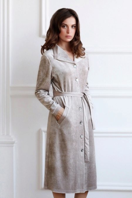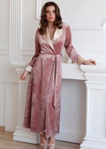 في مثل هذا الثوب القطيفة ، لن تخجل من الظهور أمام الضيوف. النسيج الفخم ، والأسلوب الممتد ، والياقة المنسدلة الواسعة ، والأزرار الكبيرة من أم اللؤلؤ والصورة الظلية المجهزة تخلق مظهرًا أرستقراطيًا حقًا.
