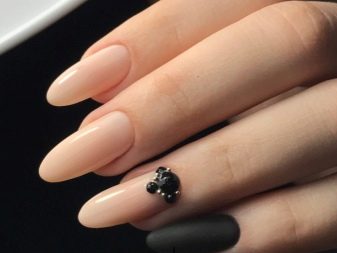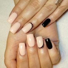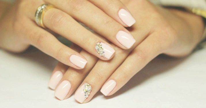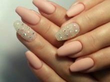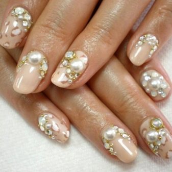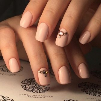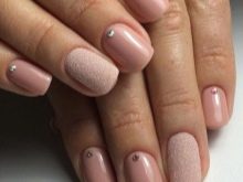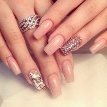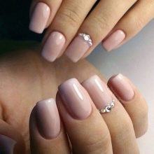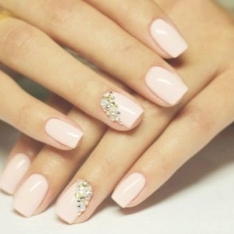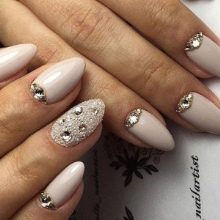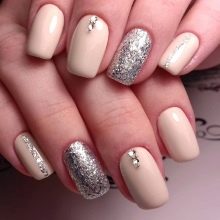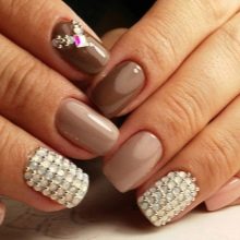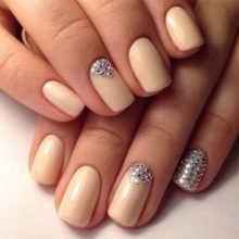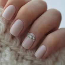 - يحب الكثير من الفتيات والسيدات الأكبر سنًا القيام بعمل مانيكير باللون البيج والتصميم باستخدام أحجار الراين باستخدام الورنيش الجل ، لأن مثل هذا المانيكير سيستمر 2 أو حتى 3 أسابيع ، لأن الأظافر المتضخمة لن تكون واضحة على الإطلاق.