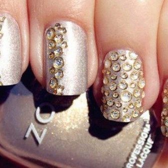 - يمكن أن يصنع أصحاب الأظافر غير الكبيرة مانيكير لطيف مع أحجار الراين الموجودة على الأظافر بطريقة فوضوية. يمكن إنشاء مانيكير بحيث يتم الحصول على تأثير القطرات ، لذلك يجب أخذ أحجار الراين بأحجام مختلفة.