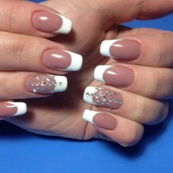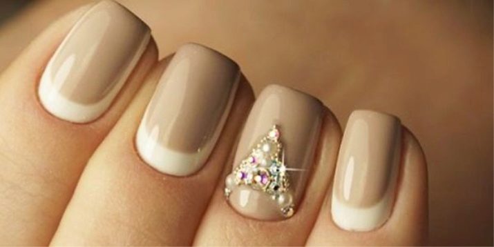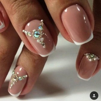 - مانيكير فرنسي كلاسيكي باستخدام ورنيش التمويه البيج سوف يتحد بشكل مثالي مع بلورات سواروفسكي الموضوعة على قاعدة الظفر. في الوقت نفسه ، ليس من الضروري تزيين جميع المسامير بهذه الطريقة ، يكفي ترتيب الإصبع الأوسط والخاتم أو الإصبع الدائري فقط.