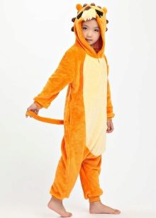 منامة الأطفال Kigurumi مصنوعة من نفس المواد تمامًا وفقًا للمبادئ الأساسية لقطع المنتجات والخياطة: تناسب فضفاض ، وجود غطاء محرك السيارة ، جيب.