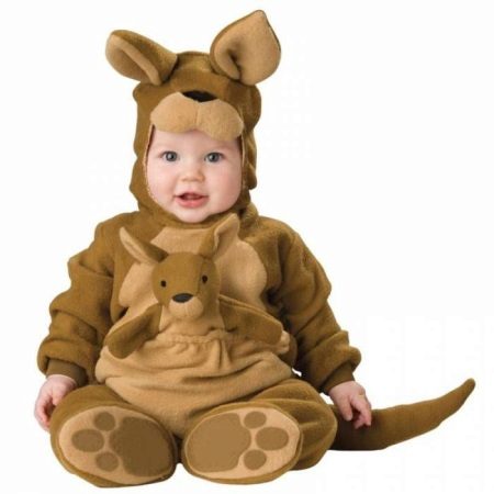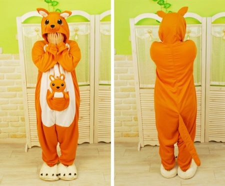 يحتوي طراز الكنغر على مشبك على شكل أزرار. كما أن هناك جيبًا على بطنه يثبت عليهم ، وهو ما يبرره كمامة مضحكة من الكنغر تطل من هناك. يتم إدخال أربطة مرنة ناعمة غير مضغوطة في الأصفاد المخيطة على الذراعين والساقين ، مما يمنع البرد من الاختراق من الداخل. غطاء المحرك عميق بما يكفي لمنع تجمد الرقبة والأذنين.