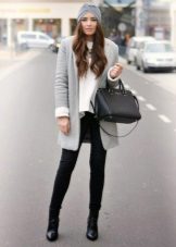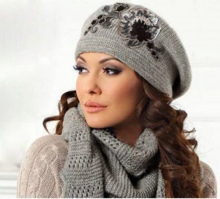 القبعات المحبوكة الأنيقة هي واحدة من اتجاهات الموسم الجديد. جميل اللون الرمادي ، زين الترتر ، وشاح محبوك لتتناسب مع البيريه - الصورة أنثوية وحساسة للغاية.