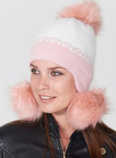 قبعة دافئة عصرية مصنوعة بالكامل بما يتماشى مع اتجاهات الموضة لهذا الموسم: تصميم مقتضب ، مزيج من الأبيض والوردي الباهت والفراء الضخمة كديكور.