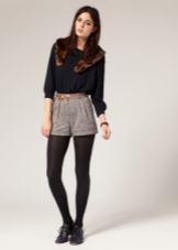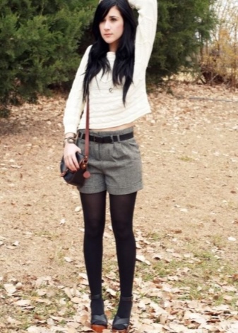 - شورت في البرد. في هذا الاختلاف ، يتم دمج السراويل القصيرة مع الجوارب السوداء. يمكن أن تكون الجوارب إما kapron أو خيارات دافئة كثيفة. تكمل الصورة بالأزرار والجلود. يمكن ارتداء كل من الأحذية الكاجوال والأحذية المسطحة على قدميك. أحذية الكاحل رائعة للكلاسيكيين. يجمع الشباب بين شورت رمادي وظلال مشرقة من الجوارب.