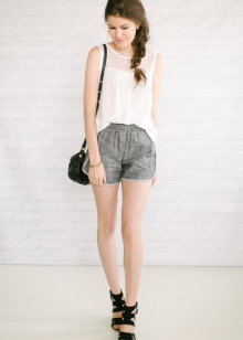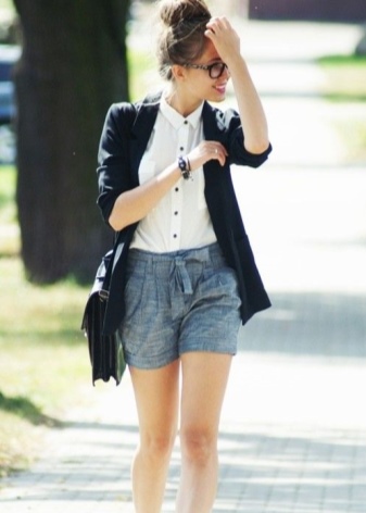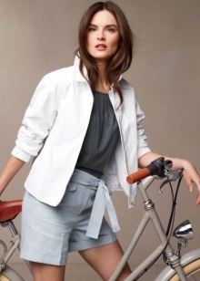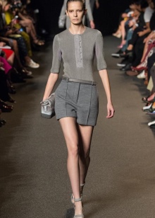 - أسلوب العمل. شورت رمادي كلاسيكي يكمله بلوزة بيضاء أو كريمية ، وفي الأعلى يمكن أن يكون هناك سترة أو سترة تتناسب مع الشورت. الألوان المتناقضة ليست ممنوعة. يمكنك استكمال المجموعة بأحذية مشرقة بكعب وحقيبة يد.