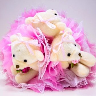 يجب شراء هذه الهدية جاهزة ، ولكن يمكنك صنع التركيبة بنفسك. كقاعدة ، يتم استخدام الدببة الصغيرة لهذه الهدية.