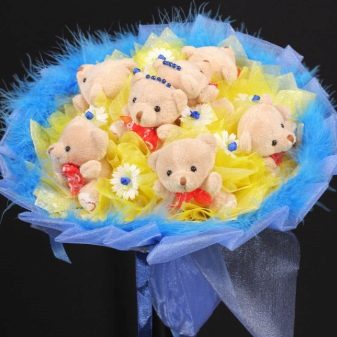 في هذه الحالة ، يجوز عمل باقة جميلة في نفس الوقت مع الدمى الطرية والزهور النضرة. وأيضا في الباقة يمكنك إصلاح العديد من الحلويات المختلفة. تذكر أن العناصر الفردية يجب أن تتطابق مع بعضها البعض بالألوان.