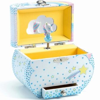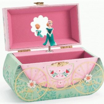 مثل هذا الصندوق ، بالإضافة إلى أقسام مختلفة بأحجام مختلفة ، لديه أيضًا شكل صغير على الغطاء كديكور. عند فتح العنصر ، يبدأ بالانتقال إلى اللحن الذي يتم نشره.