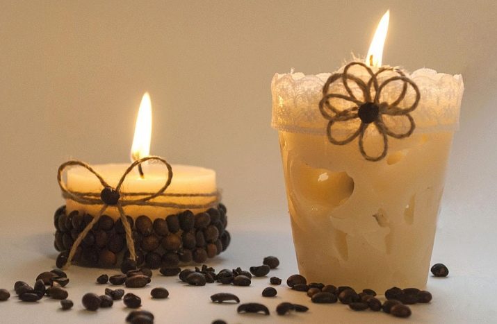 داخل الحاوية المزخرفة ، يمكنك صب رمال النهر وحبوب القهوة واللؤلؤ المتقزح اللون بألوان مختلفة. بعد ذلك ، يتم إرفاق شمعة الشمع المعطرة في الأعلى.