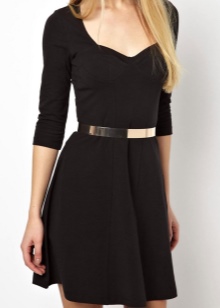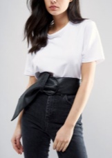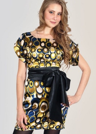 - Un ampli cinturó brillant de teixit negre amb un llaç es veurà espectacular sobre el fons d’un vestit curt amb estampats geomètrics. Un conjunt similar es pot completar amb encantadores sabates de taló alt.