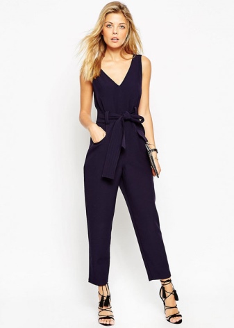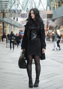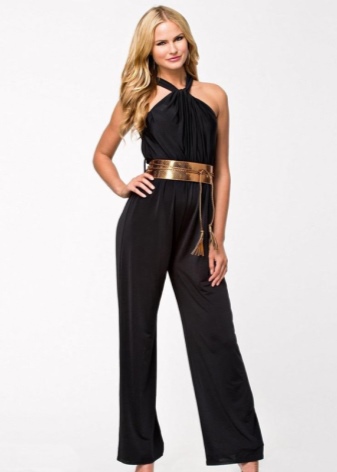 - Trieu un tema negre i potents negres ajustats. Completa un conjunt senzill amb un cinturó dur daurat. Podeu portar-vos sabates de punta o sandàlies obertes als peus.
