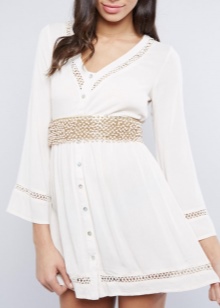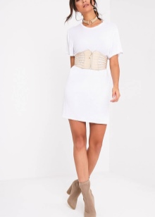 - Vesteix amb un vestit blanc amb les espatlles nues i complementa-ho amb un cinturó marró rugós amb una sivella gran. Podeu dur unes còmodes sandàlies de falda o sabates de color cinturó als peus.