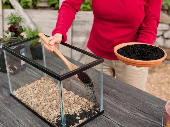 Utilitzeu els mateixos materials. Escampar el sòl de manera uniforme amb un lleuger pendent per un costat. Així, es recolliran residus de peix en un racó sense contaminar tot l’aquari.
