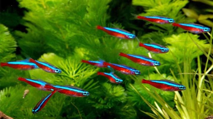 - Neons Una de les espècies de peixos més comunes i boniques entre els aquaris. Aquests habitants aquàtics es distingeixen per una interessant coloració: tenen un cos de neó pronunciat al cos que, segons l’espècie, pot tenir diferents colors. Els peixos prefereixen l’aigua freda al nivell de 18-22 graus, viuen en petits ramats de 5-6 individus.