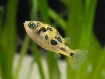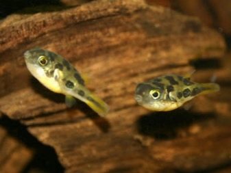 - Verd - La vista més popular i bonica per a la cria en estanys artificials, que requereix una major atenció. Color: groc-verd i taques sense forma. La longitud màxima del cos pot arribar als 20 cm. Els nadons acaben de sentir-se còmodes en aigua dolça, però els adults necessiten un hàbitat salat. Com tots els tetradons, l’espècie verda és molt agressiva i tòxica, la proximitat amb aquesta és contraindicada per a molts peixos.