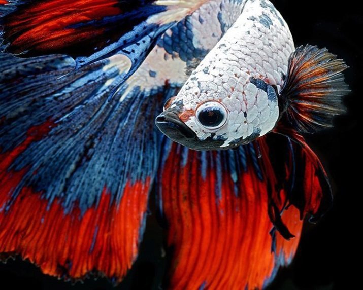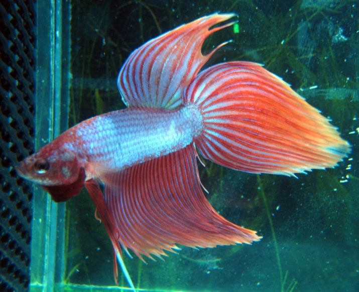 - Betta de cua de bandera Està orgullós de la seva cua llarga i elegant i dorsal amb aletes anal, amples senders que es desenvolupen darrere de la seva esquena.