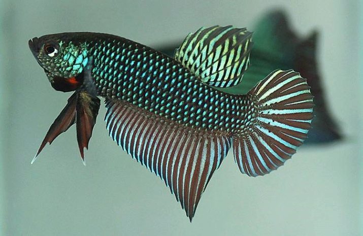 - Per a mascles de cartell o cua curta cua curta de ventall i aletes allargades. L’aleta anal té una forma punxeguda estesa a la cua. Aquesta espècie és la més propera als representants salvatges de Betta tant en aparença com en caràcter.
