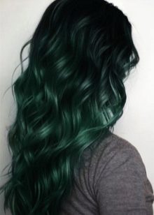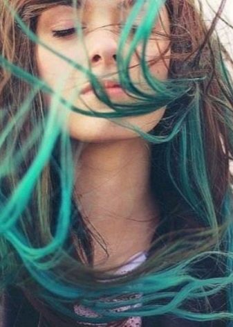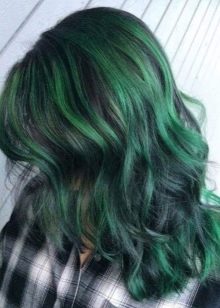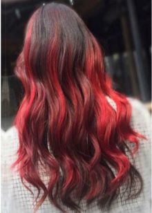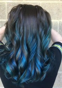 Una solució increïblement bella i de moda en la tècnica balayazh és l'ús de colors verds i blaus per ressaltar els extrems amb qualsevol ombra del color principal del cabell. En particular, una opció similar serà per a les dones de cabells foscos. Utilitzant una tonalitat vermella, podeu crear una tinta similar al joc de les flames al cabell, sempre que els rínxols siguin llargs i gruixuts.