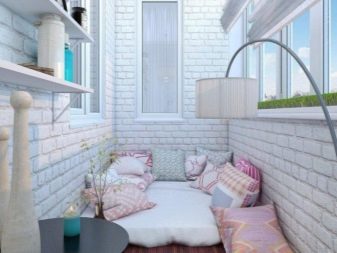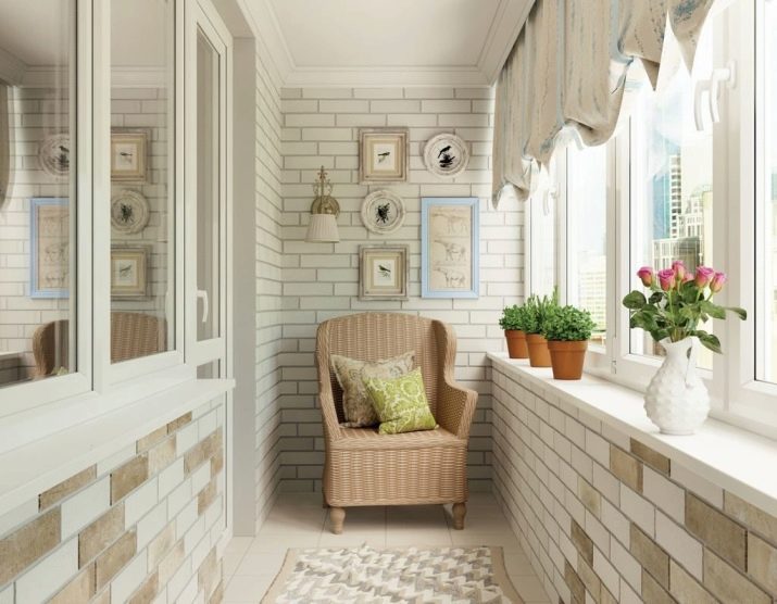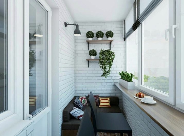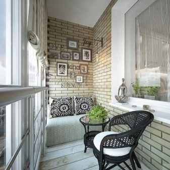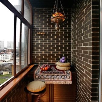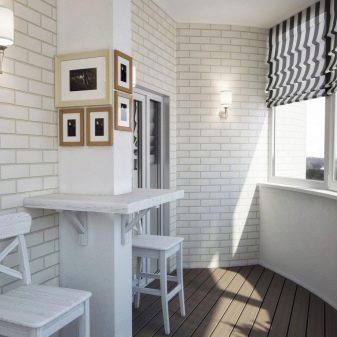 La paret de maó al balcó permet implementar idees de disseny força interessants. L’interior sempre sembla elegant i modern. Els esquemes de colors poden ser molt diferents.