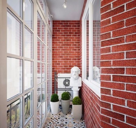 - Un maó vermell amb costures blanques té un aspecte excel·lent. El balcó estret visualment sembla més gran.
