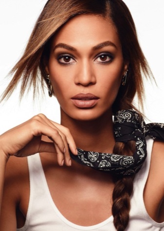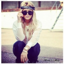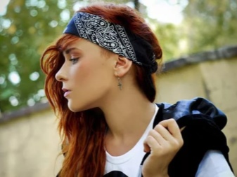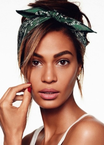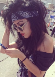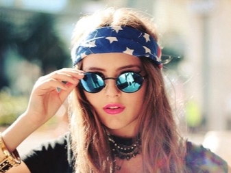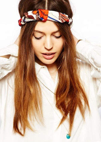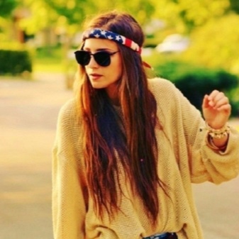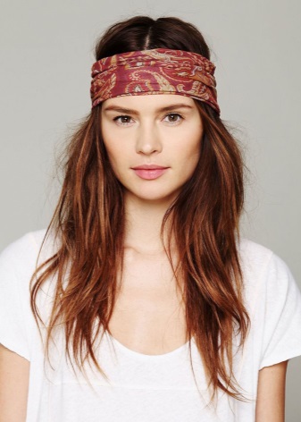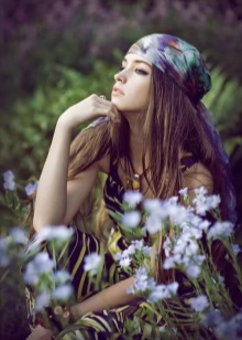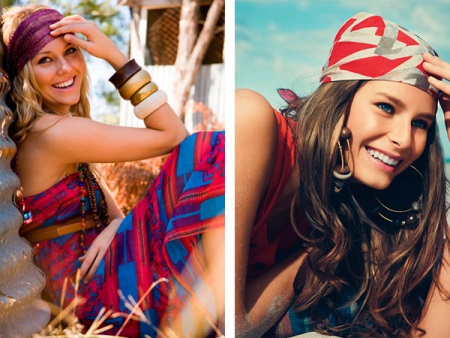 La manera clàssica de lligar bandanes en combinació amb els cabells llargs convertirà un digne digne d’estils romàntics, ètnics, hippie en un armari d’estiu. El bandana mostra motius geomètrics o ètnics, amb una composició de colors armoniosa. Una tal bandana es pot portar amb un vestit, falda maxi. Arracades grans, nombroses polseres en estil ètnic de metall, fusta, plàstic, colors naturals naturals complementaran la imatge.