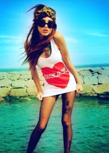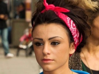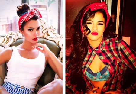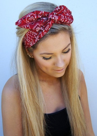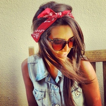 Una versió igual d’interessant de l’embenat de bandana al cap en forma de llant s’adaptarà tant a l’estil juvenil com a l’estil retro. De color vermell brillant, amb un nus coixent i extrems solts, una bandana no passarà desapercebuda. Els cabells es poden estilitzar tant en forma solta com en un manat. Un accessori brillant implica una combinació de colors una mica silenciada en la roba i la concisió. En aquest cas, una samarreta neutra, una samarreta simple i uns pantalons curts de denim o uns shorts ratllats s’adapten perfectament a la imatge. Juntament amb el bandana, es posa èmfasi en els maquillatges, el color dels quals coincideix. En general, podeu tenir una opció fantàstica per relaxar-vos, passejar, fer compres amb la disfressa d’una “noia descarada”.