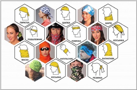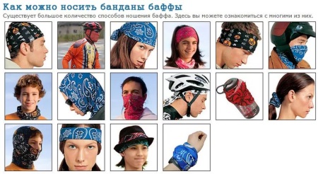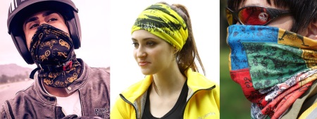 Buff Transformer Bandana també es pot utilitzar de moltes maneres. Els corredors de motos i bicicletes utilitzen com a balaclava. Altres esportistes es van posar una diadema. Algú s’utilitza com a màscara a la cara amb pols, brutícia, precipitacions. Aquests transformadors s’emeten amb tons brillants o patrons, logotips esportius, poden coincidir en color amb l’equip principal de l’atleta com a part de l’equip.