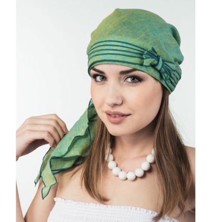 La imatge d’estiu serà romàntica amb un original bandana de lli, usat com a tocador.El lli gràcies a la seva naturalitat i higiene permetrà la pell i el cabell respirar, la protegirà del sobreescalfament i del sol. Un color verd tranquil que donarà un estat d’ànim i estarà a l’altura de la roba de la roba “estiuenca”. Un arc espectacular amb línies fosques contrastades com a decoració aportarà tendresa i sofisticació a la imatge.