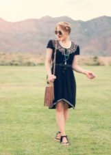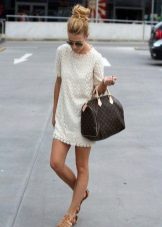 - Els gladiadors i una túnica blanca curta amb brodats populars blaus són el moment més àlgid de la propera temporada. És tan seductor i bonic! Les sandàlies altes permeten que la cama "respiri", tot i que el vestit, de fet, fa el mateix. Les ulleres de sol i una petita bossa de mà complementen l’aspecte d’un fashionista de la ciutat.