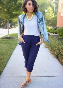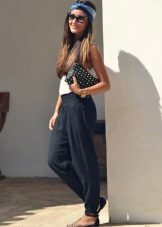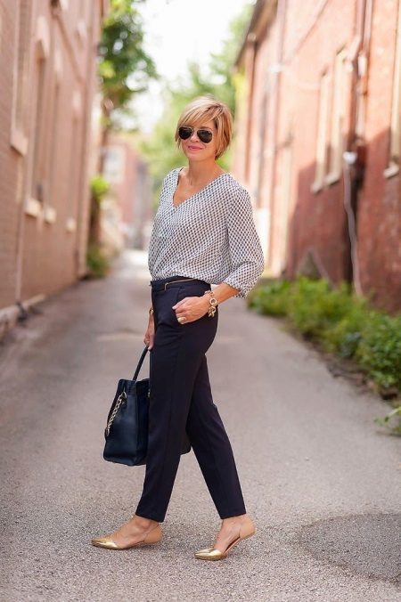 - Els pantalons blau de fletxa combinats amb una brusa fluixa de coll V són perfectes per treballar. Tot i això, aquest arc no es pot anomenar avorrit, perquè la cosa està en accessoris. Les sandàlies daurades de nas tancat, un elegant braçalet a joc i ulleres d’aviador fan la seva feina. Una bossa capaç amb una cadena ajuda a resoldre tots els assumptes importants.