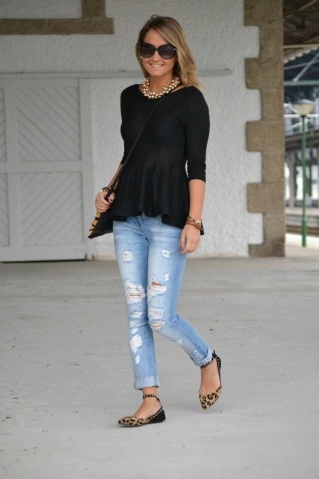 - Els ballet de lleopard de punta punxeguts s’harmonitzen perfectament amb uns texans de nòvio arrancats i una part superior negra ajustada. Una bossa amb impressió animal i masses joies afegeixen una imatge d’elegància i sexualitat. I la impressió de lleopard destaca perfectament el bronzejat.