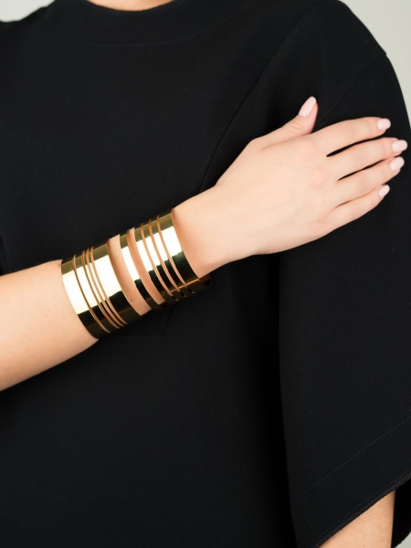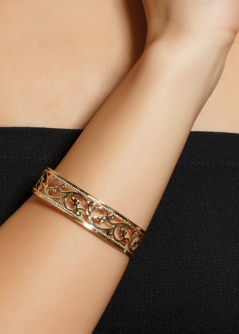 Àmplies polseres, que recorden les joies dels antics romans, complementen perfectament la bellesa de la mà femenina. Els productes prims són adequats per a aquells que tenen nina fràgils. Les polseres gruixudes o planes semblen molt boniques, però haurien de ser l’únic element destacat de la vostra imatge. Per al desgast diari, podeu recollir i llançar models amb diferents variacions. La polsera de fosa oberta de diferents tipus d'or sembla meravellosa.