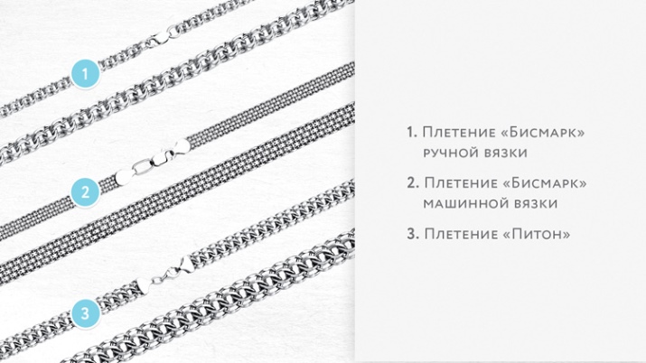 Actualment, hi ha més de 70 tipus de teixit, cadascun dels quals és únic a la seva manera. Bismarck és un dels teixits més difícils, que sovint es fa de forma manual. Els enllaços aquí consisteixen en diversos anells multidireccionals. Combinant-se amb patrons estranys, el teixit forma posteriorment un conjunt durador i delicat.