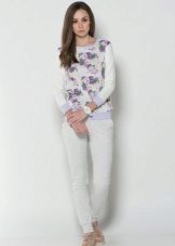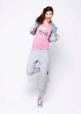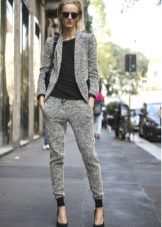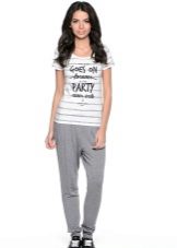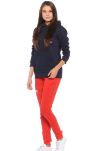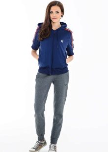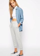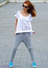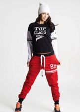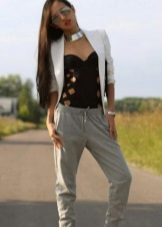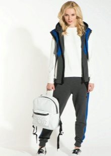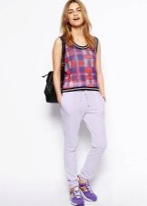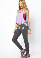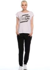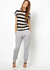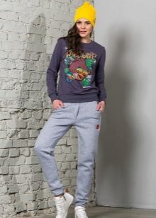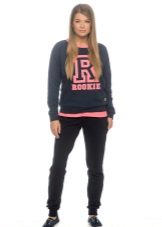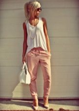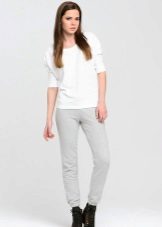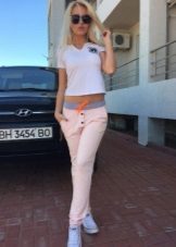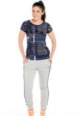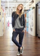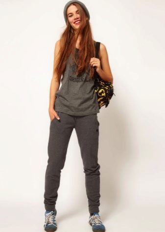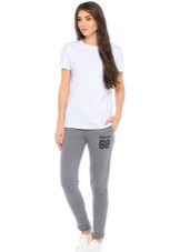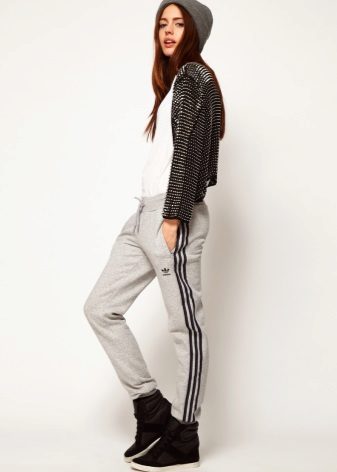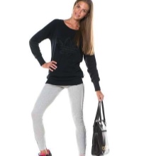 Els calçotets de pell s’han de dur amb roba esportiva i roba casual: samarretes, samarretes, samarretes, paravents, dessuadores, dessuadores. Els pantalons lacònics sense detalls i estil esportiu pronunciats es poden combinar amb samarretes, blazers, túniques, jaquetes. Una imatge contrastada es pot completar amb sabates de taló alt, sabates planes, mocassins, sandàlies. Les sabatilles esportives, les sabatilles esportives sempre són adequades per a pantalons esportius. No s’han de portar sabatilles i botes ugg.