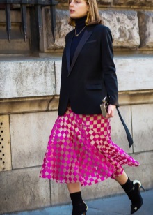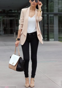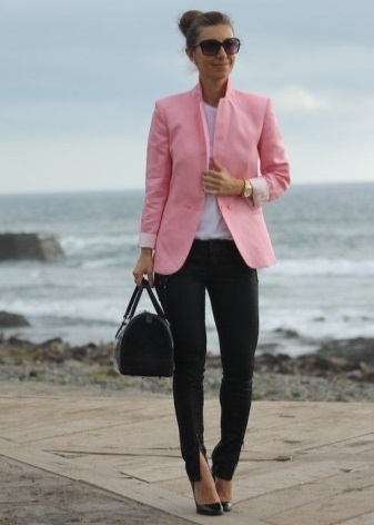 Els texans negres clàssics juntament amb una camisa o jaqueta rosa accentuen la vostra elegància. En aquest vestit, pots anar a la feina amb seguretat. Per a la festa, és adequat l’opció contrària: pantalons de color rosa brillant i samarreta o brusa negra.