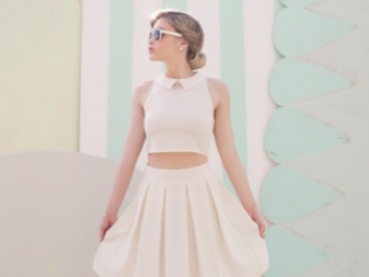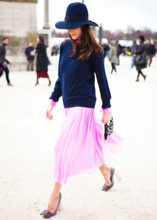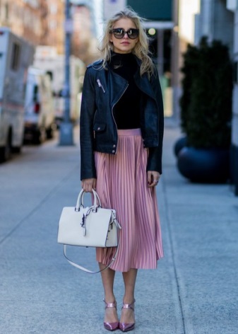 Les faldilles llapis estrictes es complementaran perfectament amb bruses amples. Els braços o talons de color groc brillant es combinaran amb vestits, faldilles o pantalons curts de color rosa pàl·lid. En aquesta imatge és millor donar preferència a bruses o camises de colors pastel tranquils.
