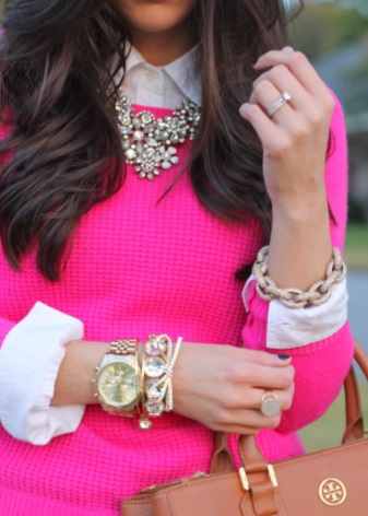- Indignant donarà a la teva imatge un color rosa brillant. Aquesta és una ombra molt activa. El millor és combinar-ho amb colors primaris tènue en el vostre vestit. Al mateix temps, abandona la combinació de rosa brillant amb negre. Aquests colors són massa contrastats i els colors circumdants d’aquests tons només seran molestos.