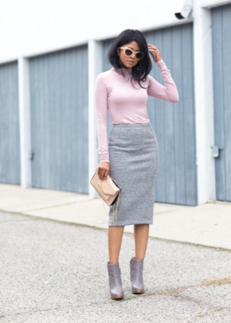 Les faldilles grises complementaran perfectament les bruses de color rosa clar. Aquestes imatges es poden complementar amb talons i bosses de tons freds. Un vestit estricte de treball dos tons grisos es dilueixen idealment amb una brusa rosa i una bossa blanca. El vestit midi o mini rosa es dilueix millor amb jaquetes o bosses de colors grisos o blaus pàl·lids.