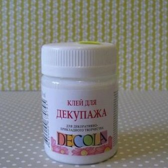 De fet La cola decoupage de gran qualitat no té una olor punxent, molt gruixuda o, per contra, consistència líquida. Quan s’utilitza, no s’enfosqueix i durant l’assecatge no deixa marques. Les dones agulles experimentades afirmen que una eina especial fa que el producte resultant sigui més viu i atractiu.