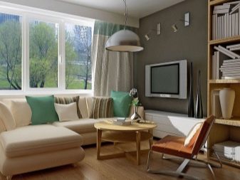 - Davant la finestra d'una petita sala d'estar, podeu posar un sofà lluminós en forma de la lletra "G".S’ha de col·locar una taula rodona de fusta a prop, i a la paret del costat hi podeu penjar un petit televisor.