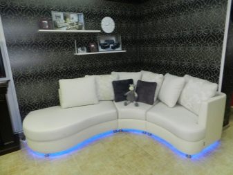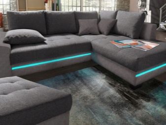 - Models d’aspecte modern i elegant amb llum de fons. Aquesta és la solució perfecta per a un interior dissenyat en un estil modern. Molt sovint, els sofàs cantoners estan equipats amb tires LED de diferents colors o focus integrats.