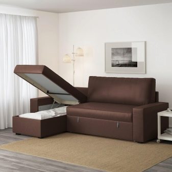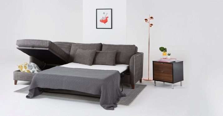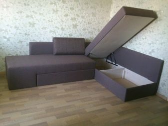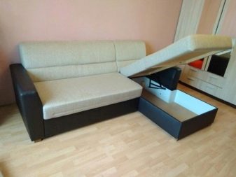 - Alguns dels més comuns són sofàs de cantonera amb un gran calaix incorporat. En aquests compartiments, la gent emmagatzema no només la roba de llit, sinó també moltes altres coses, com llibres, algunes peces de roba o sabates.