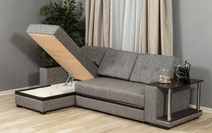 - Sovint, es proporcionen sofàs cantoners sistemes d'emmagatzematge integrats: contenidors per a la roba de llit, sabates de temporada o altres coses reservades fins al moment adequat. En aquests compartiments, més sovint situats sota seients tous, les persones emmagatzemen articles diferents. Típicament, els magatzems de sofàs de cantó són notables per una bona capacitat: poden acollir molts objectes.