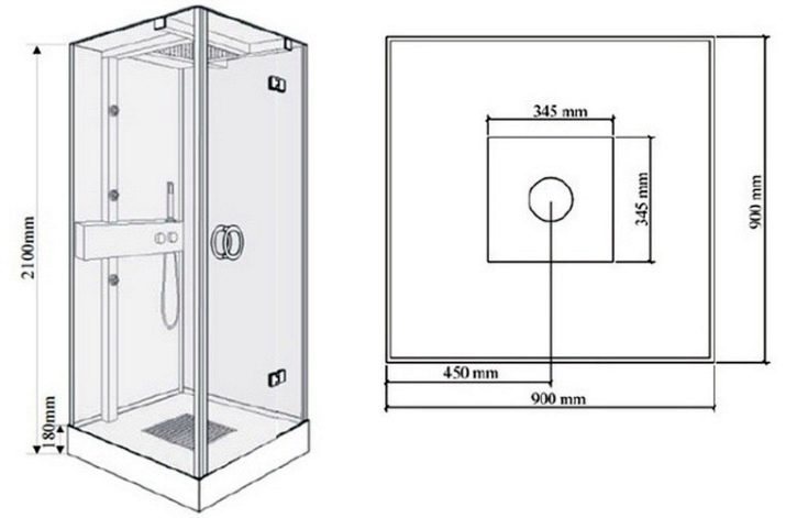 Entre les cabines de dutxa quadrades, les mides més habituals són 80x80 cm, 90x90 cm, 100x100 cm, les opcions amb un costat de 70 i 110 cm són menys habituals.Les estructures més grans, per regla general, es produeixen en lots petits o es fan a la comanda.