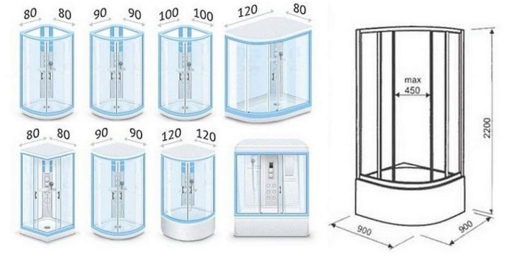 Les opcions més comunes d'hidroboxing són productes de banda igual. Els models més en miniatura són construccions amb paràmetres de 70 x 70 cm, així com 80 x 80 cm. Tanmateix, un adult, especialment un gran físic, no serà còmode nedant en un estand, per tant, els models amb dimensions de 90 x 90 cm i 100 x 100 cm són reconeguts com els més populars i comprats. pes corporal amb la comoditat de realitzar procediments d’higiene.
