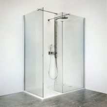Si la mida del bany permet col·locar la cambra de dutxa paral·lela a la paret, la part frontal queda totalment tancada. El pas a la dutxa queda de costat. El vidre es fixa amb fixacions especials al terra i a les parets. El nombre de fixadors depèn de la mida de la xapa de vidre. Aquest disseny no està equipat amb peces mòbils (portes).