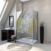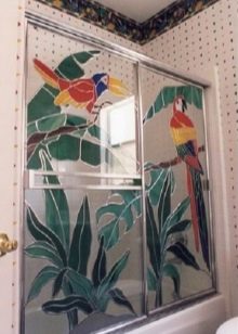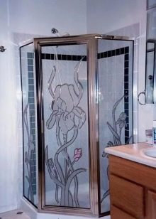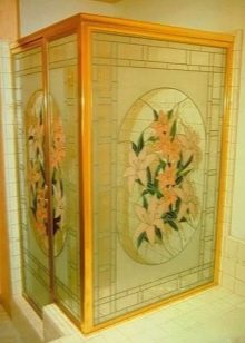 - Vitralls. Gràcies als productes de vitralls, podeu crear decoracions úniques al bany. Aquestes portes i envans de la dutxa estan disponibles en comandes especials. El dibuix és la clau del disseny de tota la dutxa. El cost dels productes depèn de la complexitat i del detall de la imatge.