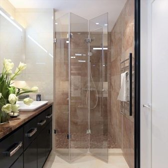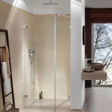 - Per a grans banys, s’adapta bé una partició de vidre amb formes irregulars. Els tons beige de la sala es combinen amb èxit amb una estructura de vidre clar. La mida d'aquesta dutxa us permet obrir-lo sense por per les esquitxades.