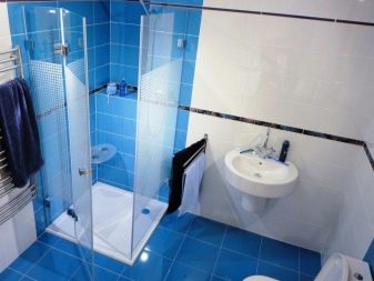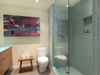 - Les envistes de vidre no són adequades només per a grans banys. Aquests dissenys es poden col·locar en una habitació petita. En aquest cas, la partició serveix com a delimitació del bany combinat. Les rajoles de paret en tons blaus darrere del vidre i un lavabo de vidre es complementen harmònicament.